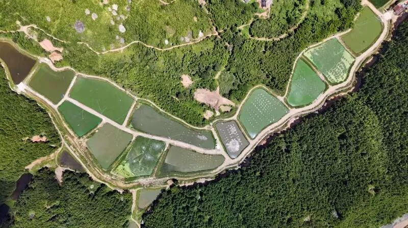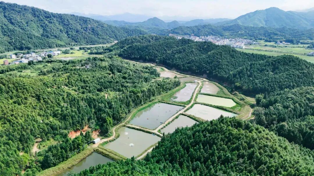 走进隘子镇罗氏虾养殖基地,四面青山环抱,数十口虾塘如镜面镶嵌在山谷间。